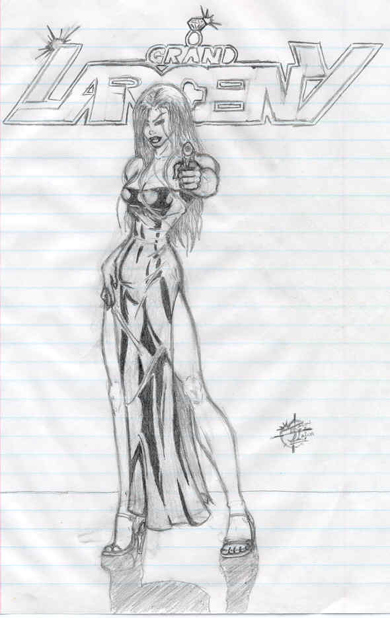 ??.?? One day I had an idea for a character and I just had to sketch her real quick. This is the result. She's just a thief ::grand larceny, get it?:: . . . umm . . . that's about it . . . I never really fully established her character. Ah well, another drawing in the ::archive folder:: If I could redraw this, the one thing I would really like to change is the left foot, specifically the toes. Rather awkward, don't ya think? Also, the left arm looks kinda masculine. |
