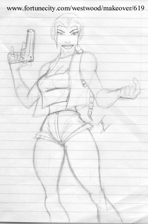 ??.?? This is one of two pics that show a turning point in my abilities. ::Here's the other one, by the way:: Again, I wanted to practice perspective on the human body. I also wanted to practice drawing females ::don't we all?:: This time, the results were more to my liking. The hands came out pretty good too. Not much detail, but, like I said, I was practicing perspective and the female figure. |