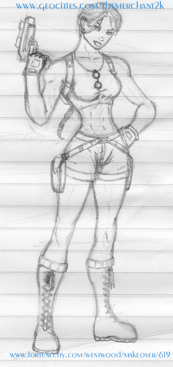 ??.?? Wow . . . I still think this pic is pretty decent after all this time. That's a rarity, believe me. The only thing wrong with this is the right arm/hand . . . they both look kinda flat. Otherwise, I love it. The legs, the torso, the head, the ponytail, the boots . . . everything looks tight. Well, maybe the gun looks kinda weird too. |