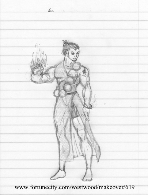 ??.?? Still one of my favorite characters, Luc is based on ::Donovan:: from Capcom's ::Darkstalkers:: game. Manohman, do I have plans for this guy . . . he will probably be my first creator-owned comic when I break into the comic industry. He'll probably undergo a wardrobe change so as to avoid copyright infringements. BTW, the shoes are based on those And-1 ::After Party:: slip-on shoes. Let's see. His right arm looks awkward and somewhat detached from the torso. The oversized beads are cool, but there should be one slightly hidden above the top bead. The feet are too small. The left hand looks ::cartooney:: Otherwise, I like it. |