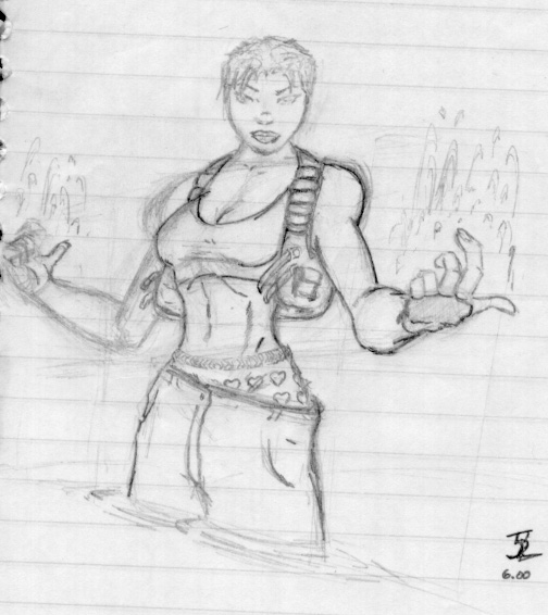 06.00 Another sketch swiftly drawn at school. Again, very rough; I was just trying to bus' out a quick character. Also, my main focus was perspective on the body, although it didn't come out as good as I had hoped. (Notice the guidelines.) My favorite part is the face, especially the hair. The left hand looked better when I first drew it. |