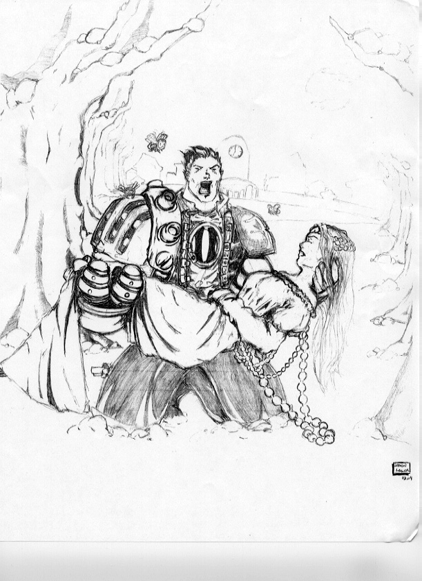 Completed 04.02.01. This was supposed to be my entry in an online Art Contest, but once I realized that I wouldn't finish in time for the deadline, I decided to slow down and take my time. I added a background, tons of shading, some rendering, and snow on the ground. This was going to be my biggest illustration to date, however . . . There are a few things wrong with this pic. First, the expression on Steampunk's face is downplayed. In other words, I should have drawn his head thrown back to convey more emotion. Also, because this pic takes place at night, shading on the trees and on the background is a necessity that was sadly left out of the pic. Further, the background is rather lackluster and boring. In my opinion, everything else was done well . . . I especially like how his machine arm came out, more specifically the vents. I should have added some smoke coming out of them, though. |