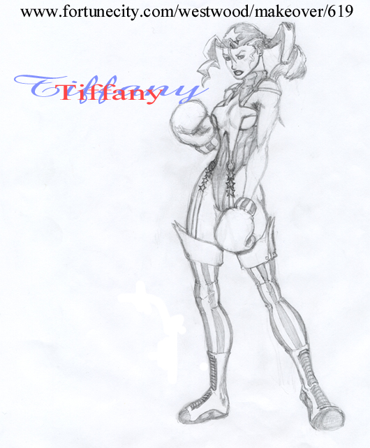 ??.99 Tiffany from Capcom's Rival Schools. You wouldn't believe how much of my time was spent on this. I believe I did about 3 different revisions before it looked the way I wanted it too. At the time, I was addicted to ::Rival Schools:: and Tiffany. I just thought her costume was just too outrageous not to draw . . . too bad her character kinda sucked in the game. Looking back, this pic isn't so bad. The left calf looks like a ballon, but otherwise, this pic still looks mighty fine if I do say so myself. I especially like the hair, the left boot, and the way I handled the costume. Also, if you look hard enough, you'll see the slight rendering I did on the gloves and the shading on the upper portion of the costume. |